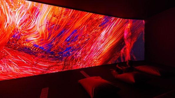 Di bagian tengah pameran, kamu bisa merasakan pengalaman audiovisual imersif melalui karya Evolver (2022) dari Marshmallow Laser Feast. Instalasi ini membawa kamu “masuk” ke dalam tubuh manusia, mengikuti perjalanan oksigen melalui paru-paru. Pengalaman ini semakin mendalam dengan narasi suara dari Cate Blanchett, serta musik dari Jonny Greenwood dan Jóhann Jóhannsson.